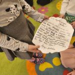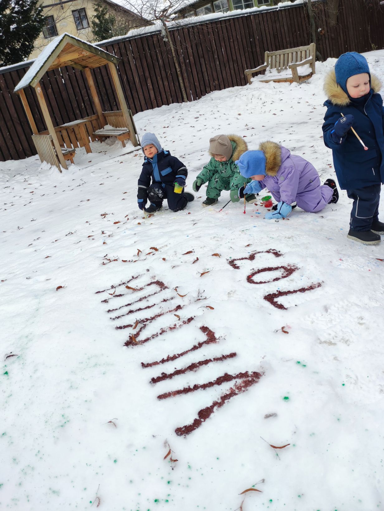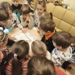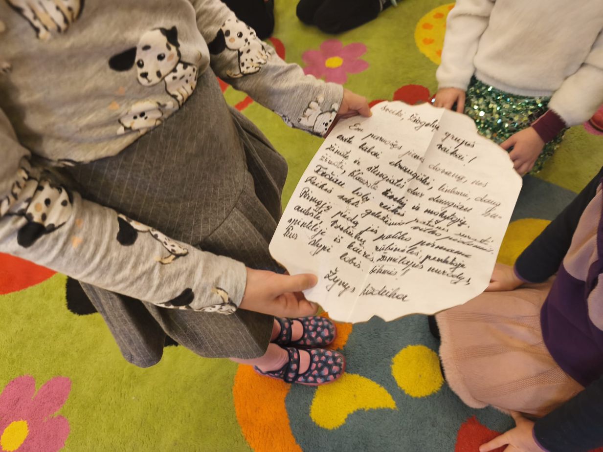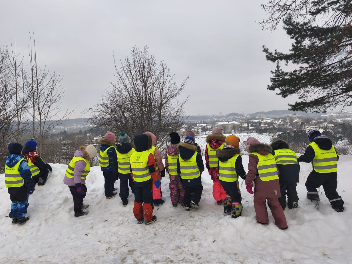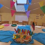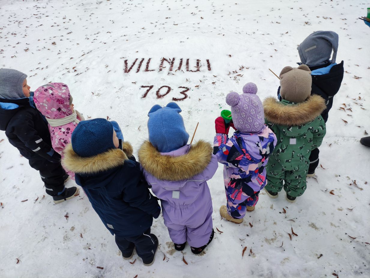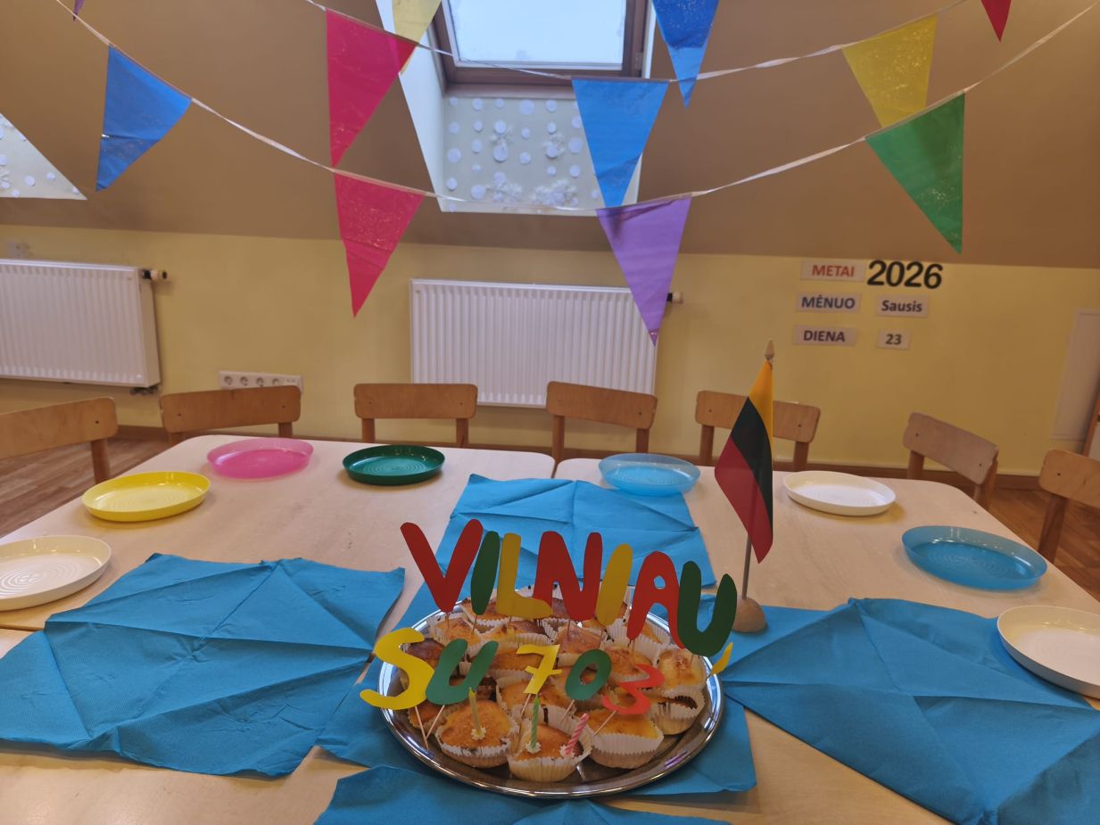 Gimtadienį šventėme taip: grožėjomės Vilniaus stogais, stebėjom teatriuką apie miesto atsiradimo istoriją, ieškojom lobio. Taip pat kepėme keksiukus, kūrėme Gedimino klaną, piešėm sveikinimą ant sniego.